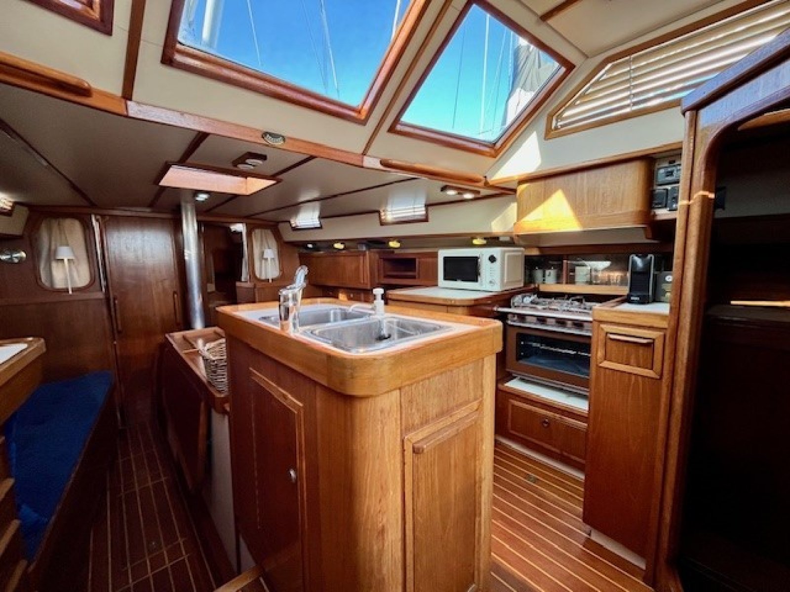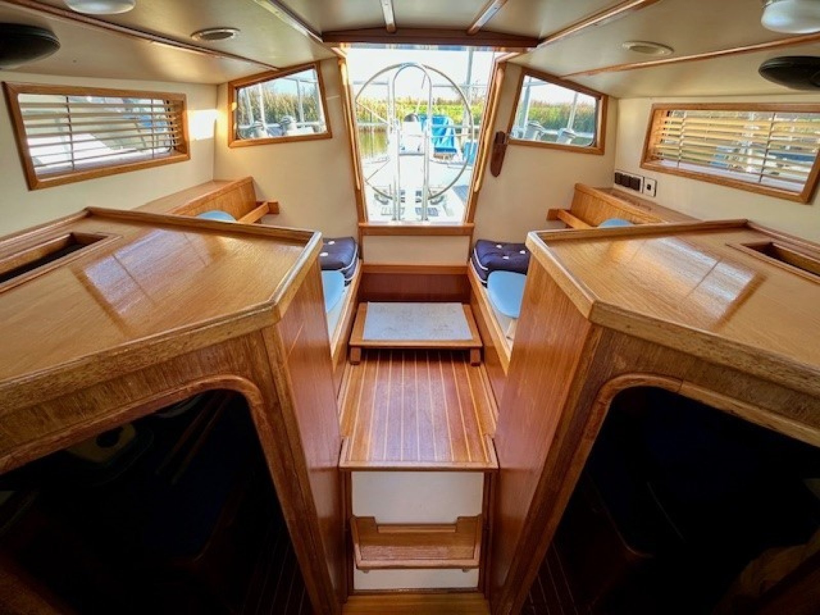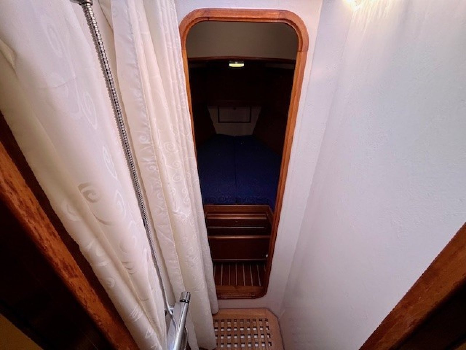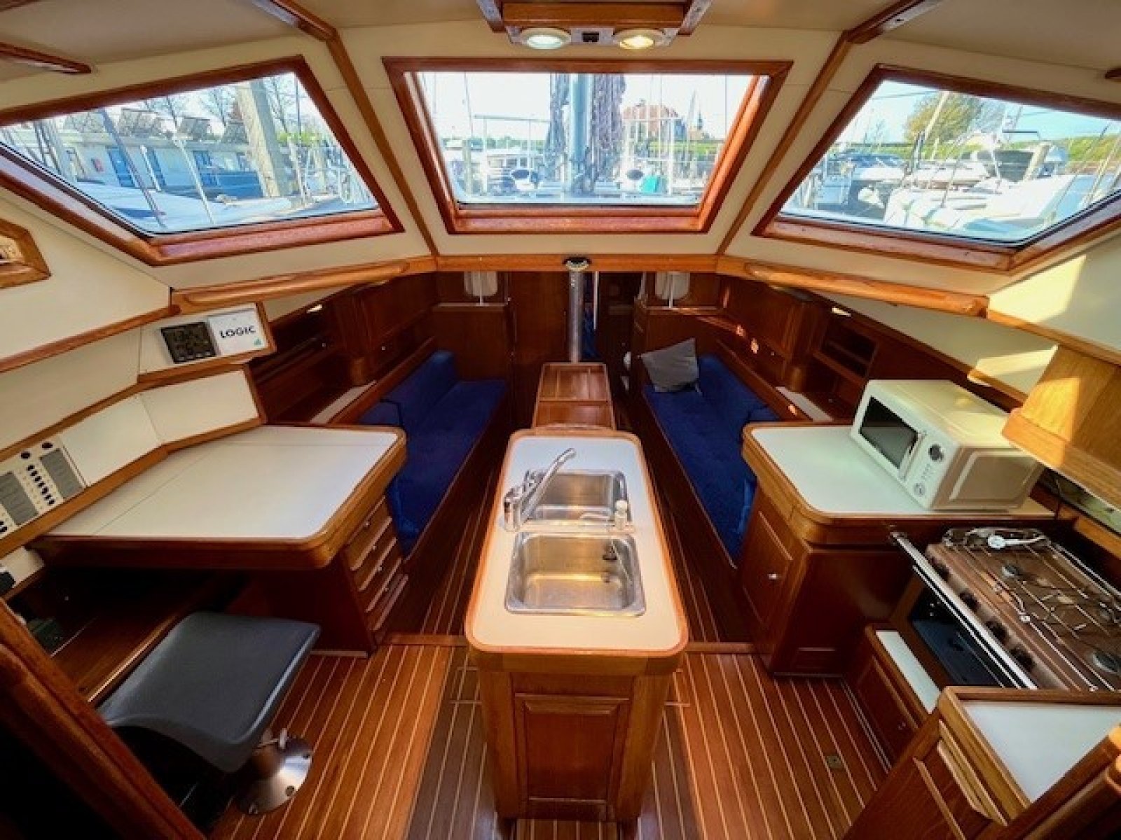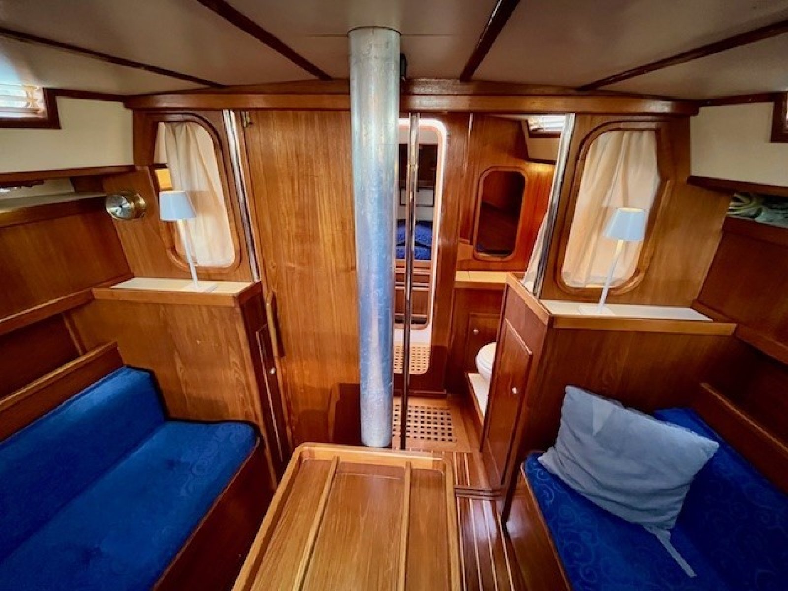 Dieses Northern Comfort kann zu Recht als Schiff bezeichnet werden: Robust, funktionell und komfortabel für Langfahrten. Ein solide gebauter Rumpf (isoliert) mit Kielschwert ermöglicht einen guten Tiefgang für Seereisen und die Erkundung flachere Gewässern. Die Ruderkonstruktion eignet sich dabei für eventuell "Trockenfallen". Das 'Doghouse' bietet einen geschützten Platz bei rauen Bedingungen unter Segel, oder kann als komfortable Unterkunft mit Rundumsicht benutzt werden. Die Aufteilung ist gut durchdacht und praktisch und bietet u.a. drei separate Kabinen und einen separaten Duschraum. Der sehr große Salontisch bietet reichlich Platz für alle Crewmitglieder und Gäste.
