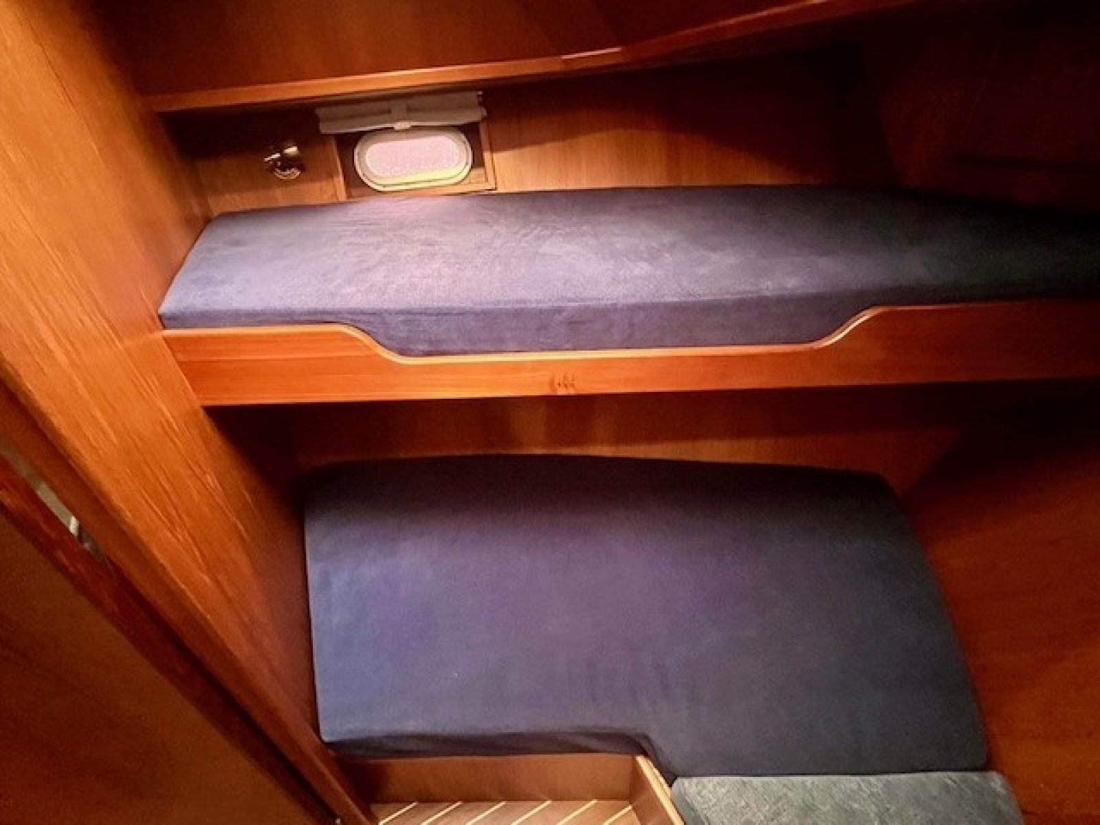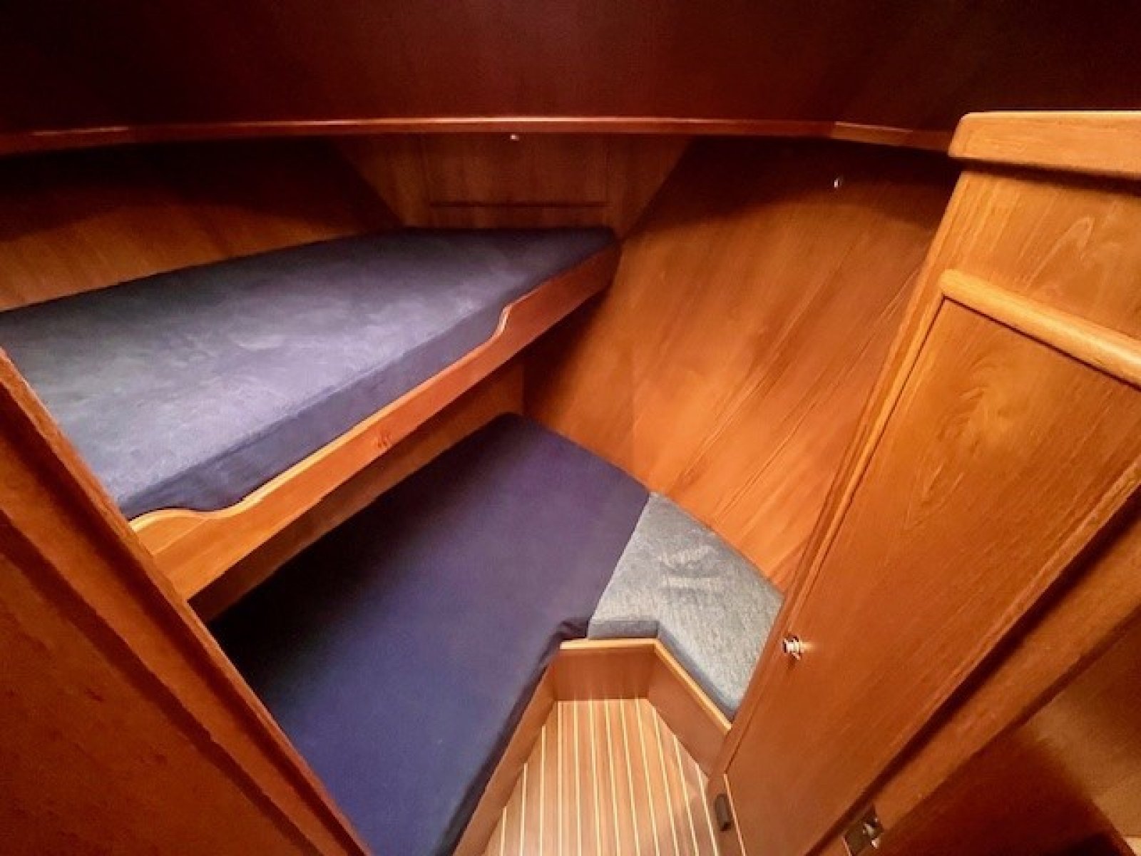 Tweepersoons vrijstaand bed in achterkajuit. Stapelbed in voorkajuit. Twee extra slaapplaatsen op dinette mogelijk.