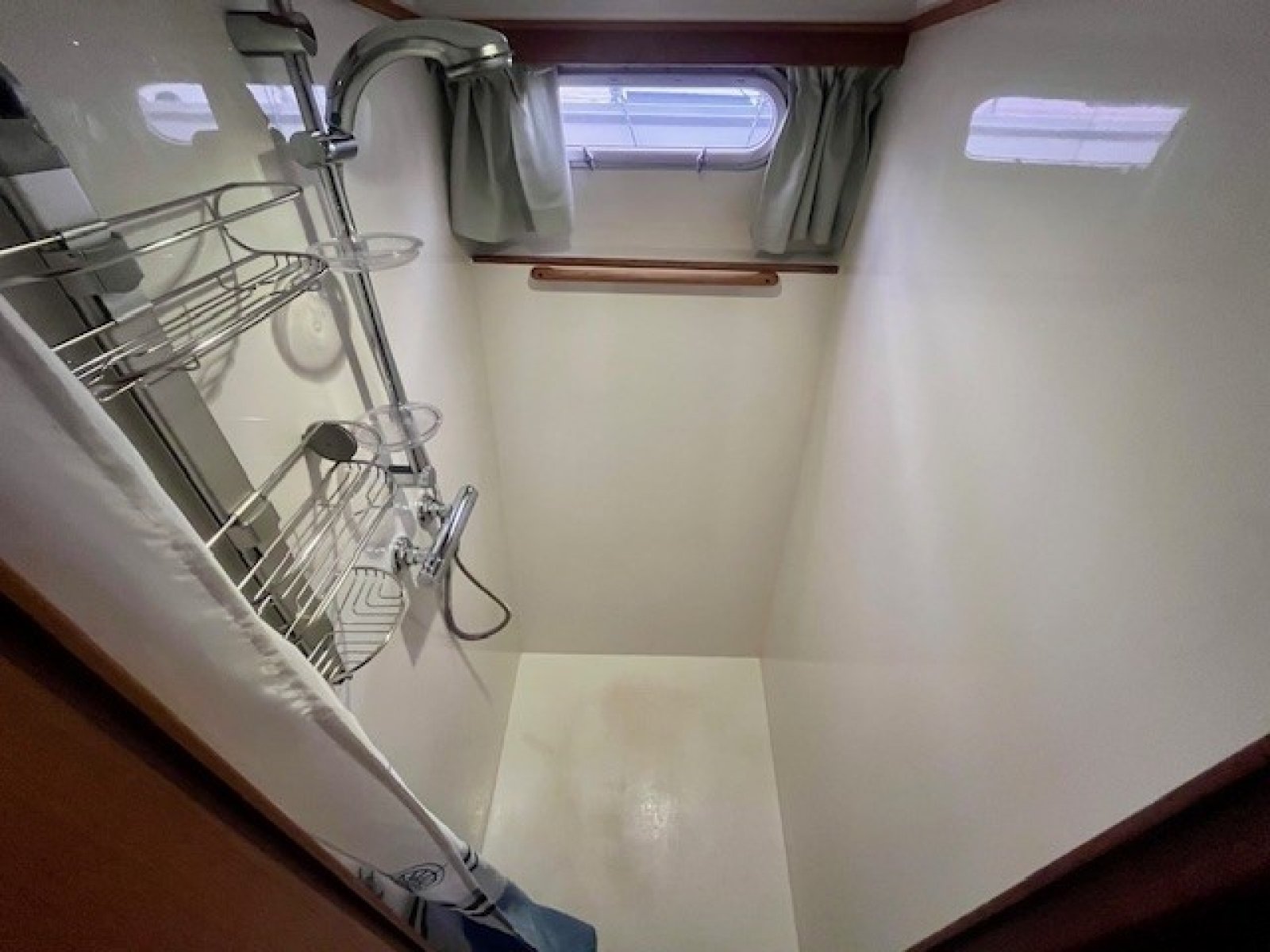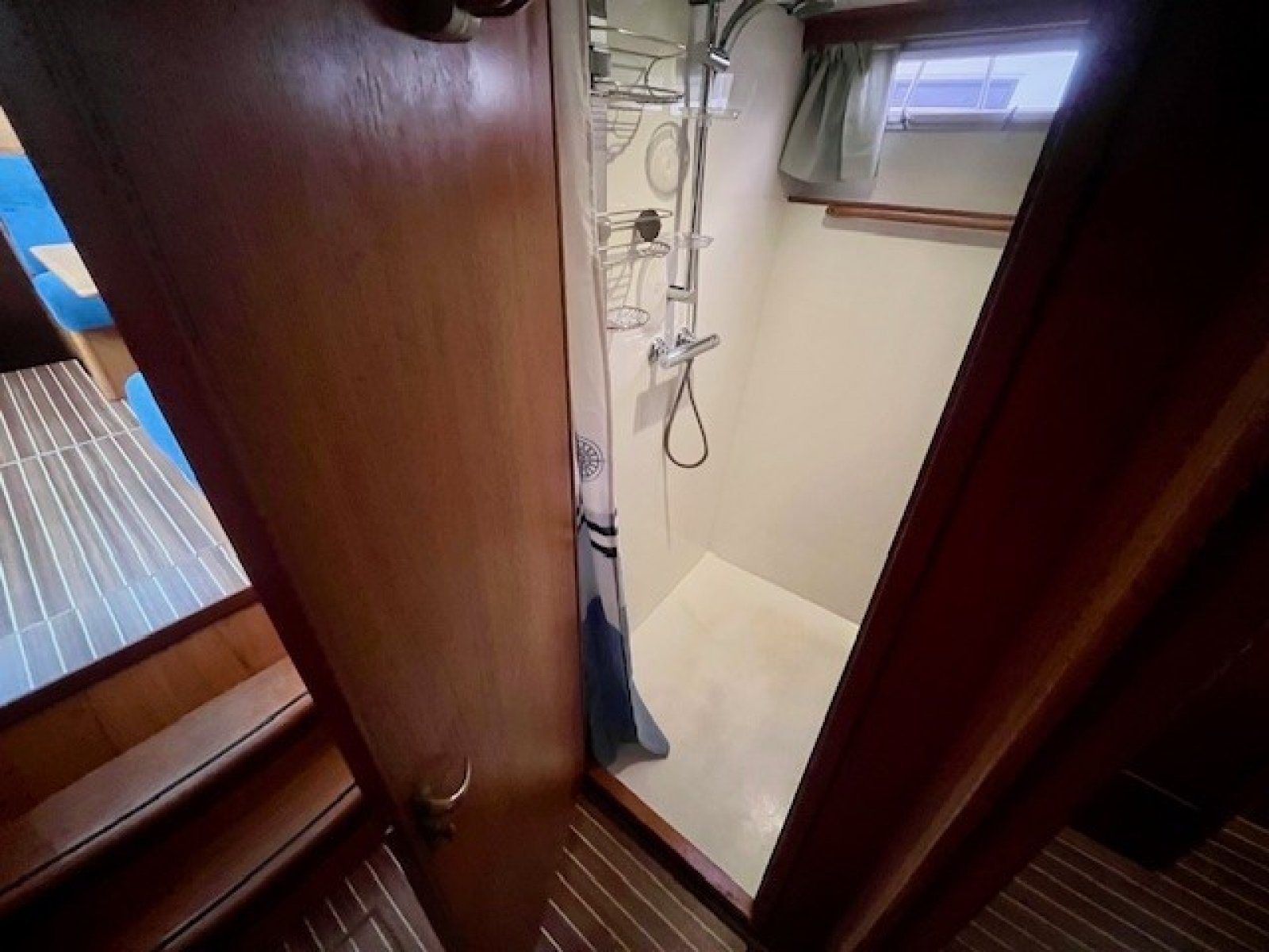 Separate doucheruimte in bakboord achterschip. Douche met warm/koud water op achterschip