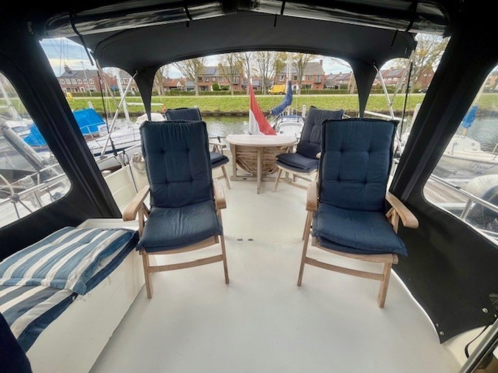 Doorvaarthoogte met staande mast: 5.50 m. Doorvaarthoogte met (elektrisch) gestreken mast: 3.75 m. Door deels verlagen kap en bimini op schuifbare rail een doorvaarthoogte van 3.55 m. Eventuele minimale kruiphoogte 2.47 m. door klapbaar windscherm