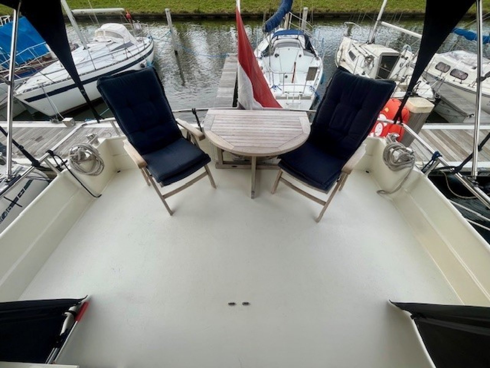 - Teakhouten stoelen en tafel op achterdek
