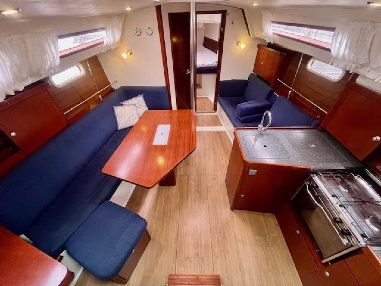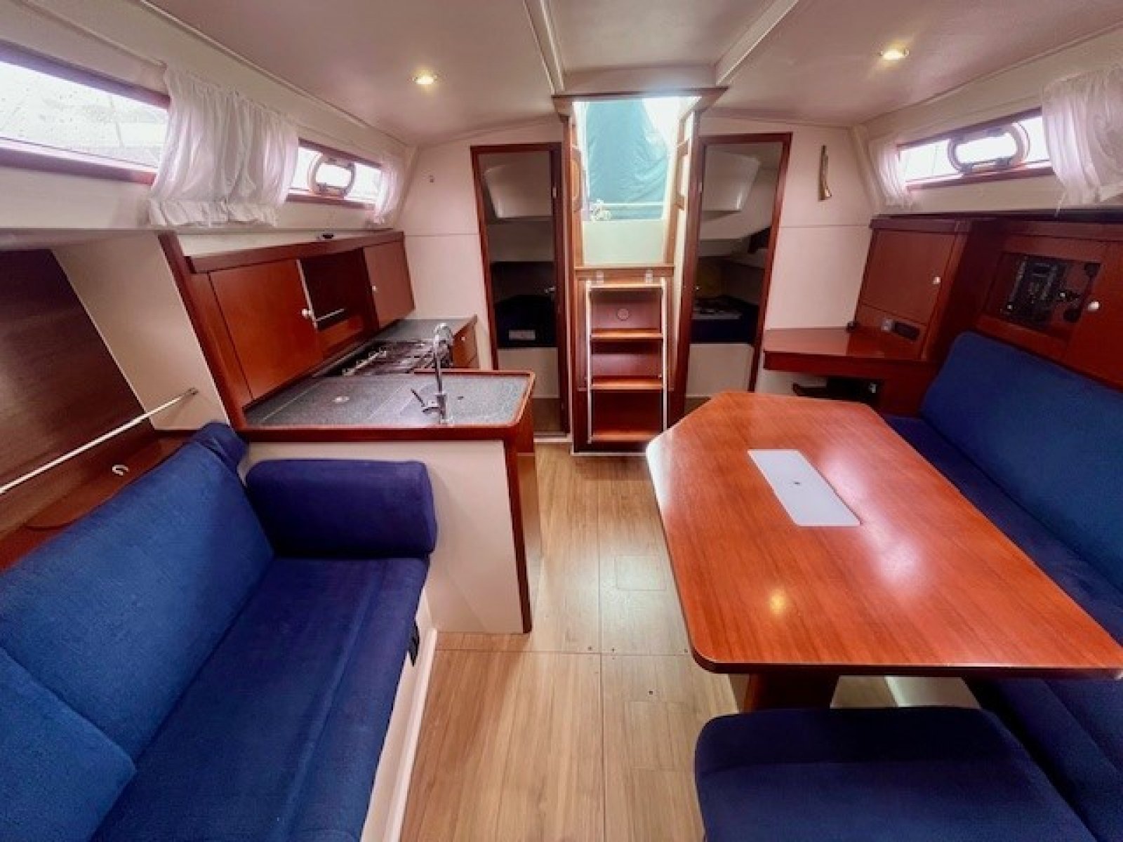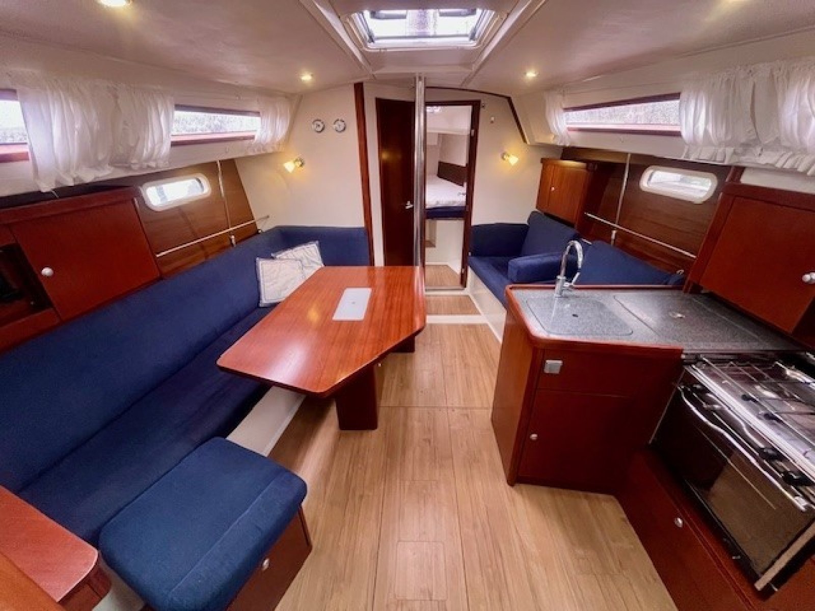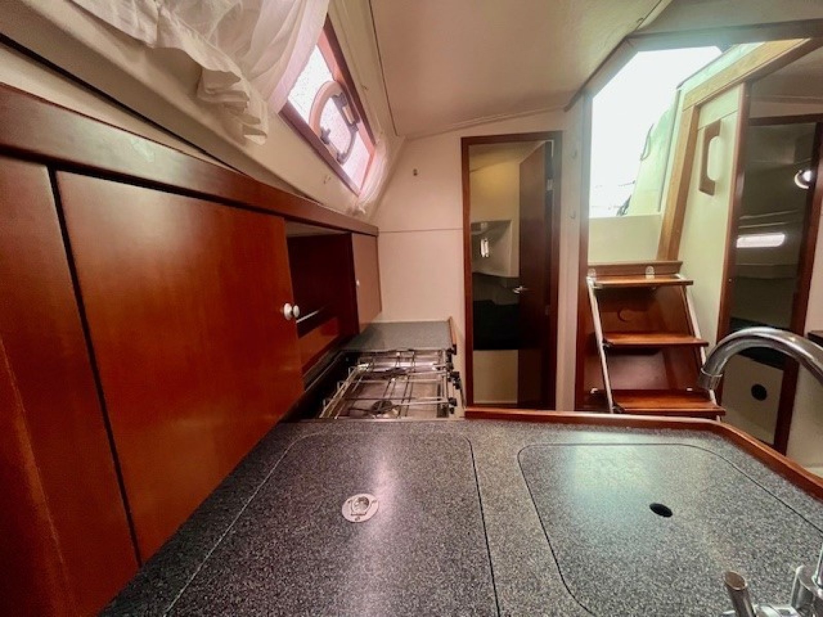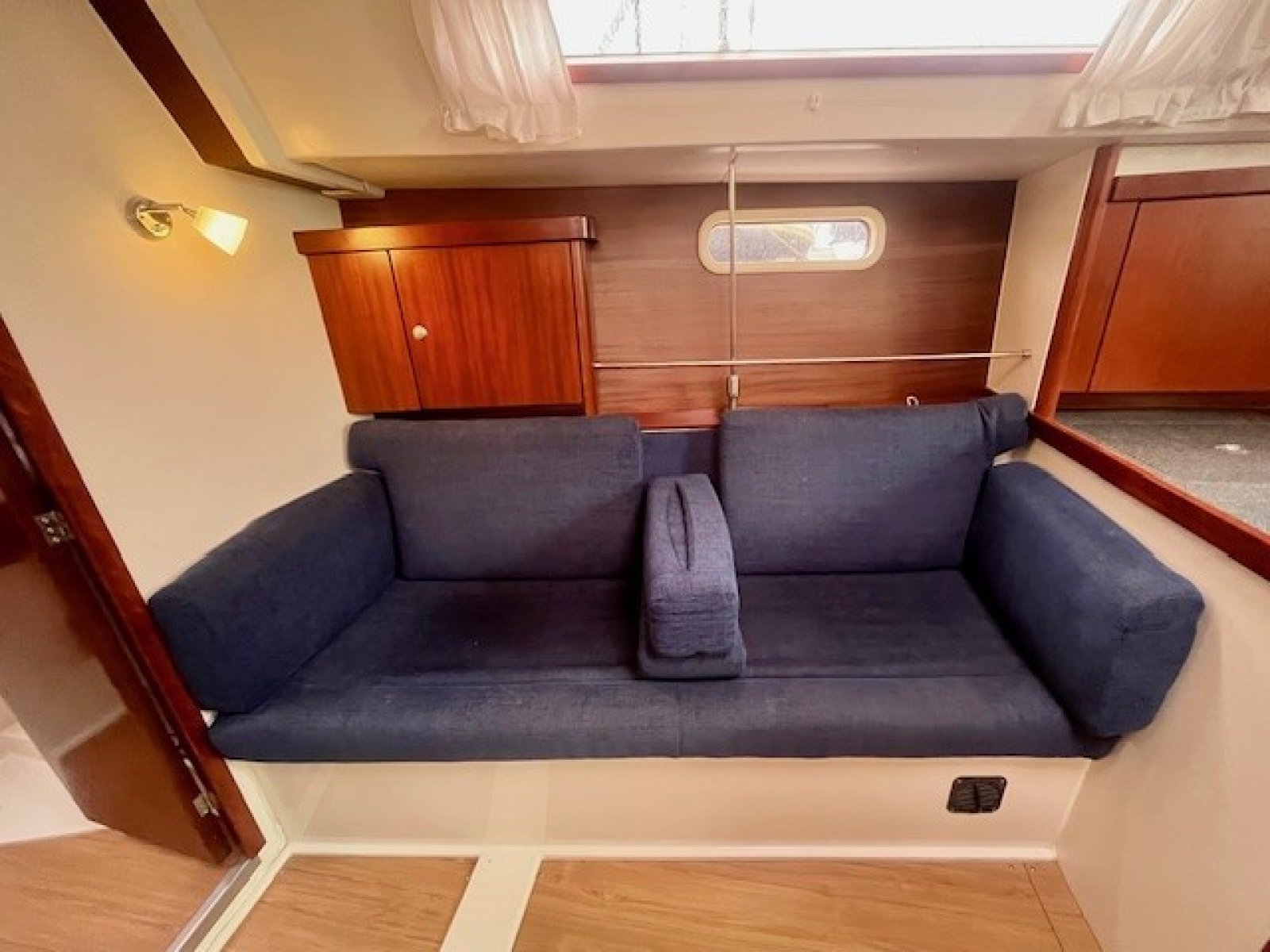 Deze Hanse 350 biedt en voorkajuit en achterkajuit, waarbij er een extra achterkajuit gecreeerd is aan bakboord zijde. Door het wegnemen van het matras is deze ruimte natuurlijk ook functioneel als bergruimte te gebruiken.